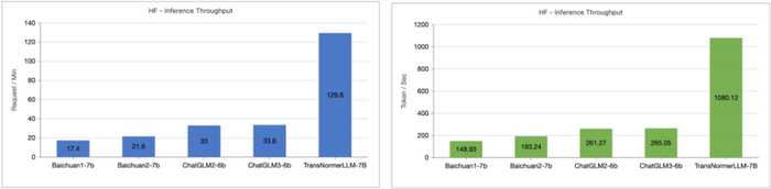 笔者测试了 Lightning Attention-1 加持的 TransNormerLLM-7B 与常见的 7B 模型在推理速度上的对比。如下图所示,在近似参数大小下,Lightning Attention-1 的吞吐速度是百川的 4 倍,ChatGLM 的 3.5 倍以上,显示出了优异的推理速度优势。