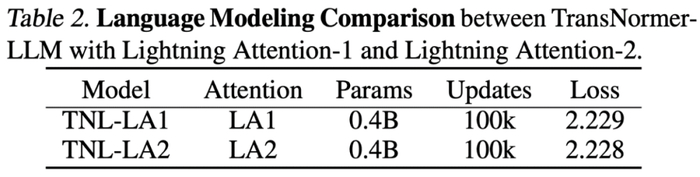 研究人员首先在小规模(400M)参数模型上对比了 Lightning Attention-2 与 Lightning Attention-1 的精度区别,如下图所示,二者几无差别。