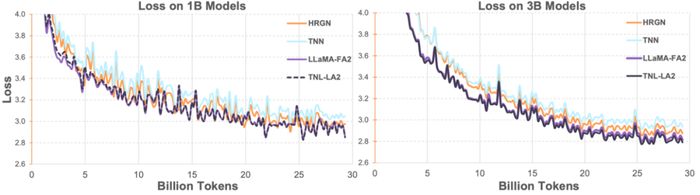 随后研究人员在 1B、3B 上将 Lightning Attention-2 加持的 TransNormerLLM(TNL-LA2)与其它先进的非 Transformer 架构的网络以及 FlashAttention2 加持的 LLaMA 在相同的语料下做了对比。如下图所示,TNL-LA2 与 LLaMA 保持了相似的趋势,并且 loss 的表现更优。这个实验表明,Lightning Attention-2 在语言建模方面有着不逊于最先进的 Transformer 架构的精度表现。