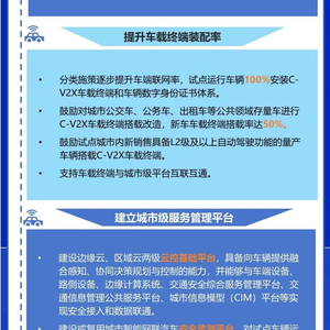 二是提升车载终端装配率,分类施策逐步提升车端联网率,试点运行车辆100%安装C-V2X车载终端;鼓励公共领域存量车进行C-V2X车载终端搭载改造,新车车载终端搭载率达到50%;鼓励试点城市内新销售具备L2级及以上驾驶自动化功能的量产车辆搭载C-V2X车载终端。