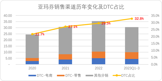 这也是安踏带给亚玛芬中国产业链供给,带动毛利率步步攀升的核心优势。(3)DTC及高昂的折旧成本招股书中提到最多的非财务数据改变,就是学习安踏FILA打法的那一套—DTC模式。效果目前看来还不错,亚玛芬越3成的销售额来自于DTC模式,其中,电商销售占比为44.4%,线下零售占比为53.6%。