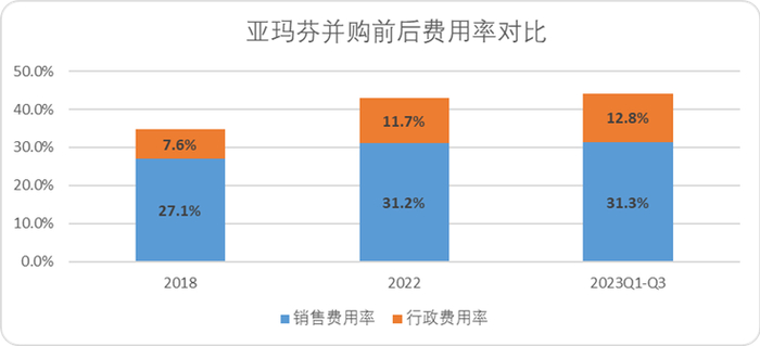 (4)不理想的营运效率如果说前三点是开源,是亚玛芬招股书中的亮点,那么节流这一个环节,安踏并没有给亚玛芬带来足够理想的效果。2023年前三季度,亚玛芬无论是销售费用率,还是行政费用率,都明显高过收购前的水平。整体费用率较并购前高出9.8%。