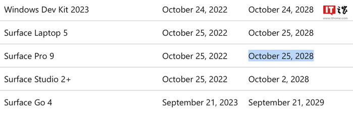 Surface Pro 9 是微软目前的旗舰 Windows 11 平板电脑,该产品发布于 2022 年 12 月,可选英特尔 12 代酷睿 /SQ 3 处理器,其中英特尔款拥有六年的生命周期,IT之家查询微软支持页面得知,这款设备将于 2028 年 10 月 25 日结束支持(驱动程序和固件更新)。