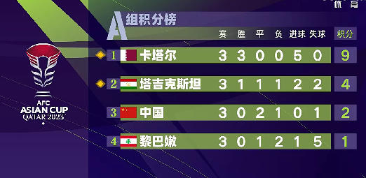 虽然比赛补时长达10分钟,但国足在最后阶段仍难组织起有效进攻,最终0比1不敌卡塔尔队。同组的另一场比赛中,塔吉克斯坦队2比1力克黎巴嫩队,以小组第二名身份出线,国足2分、0进球排名第三位。虽然其他小组的比赛尚未全部结束,但国足要想以成绩最好的四个第三名身份出线已经很难了。如果就此出局,那么这将是国足历史上第四次亚洲杯小组出局,且历史上第一次在亚洲杯决赛圈中一球不进!
