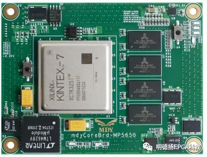 今天分享的核心板是明德扬公司研发的K7核心板,命名为MP5650。采用XILINX Kintex-7系列的XC7K325T-2FFG900I/XC7K410T-2FFG900I作为主控制器,在FPGA 芯片的HP 端口上挂载了4片DDR3存储芯片,每片DDR3 容量高达512M 字节,每片16bit组成64bit 位的数据位宽。1片128Mb 的QSPI FLASH 芯片用来静态存储FPGA 芯片的配置文件或者其它用户数据。核心板采用4个0.5mm间距120Pin 镀金连接器与底板连接,核心板四个脚放置了4个3.5mm固定孔,此孔可以与底板通过螺丝紧固,确保了在强烈震动的环境下稳定运行。核心板结构尺寸为65(mm)× 85(mm)。整个开发系统的结构如图1所示,实物图如图2所示。该板很适合高速数据通信;视频采集、视频输出、消费电子;机器视觉、工业控制;项目研发前期验证;电子信息工程、自动化、通信工程等电子类相关专业开发人员学习等领域及人群。