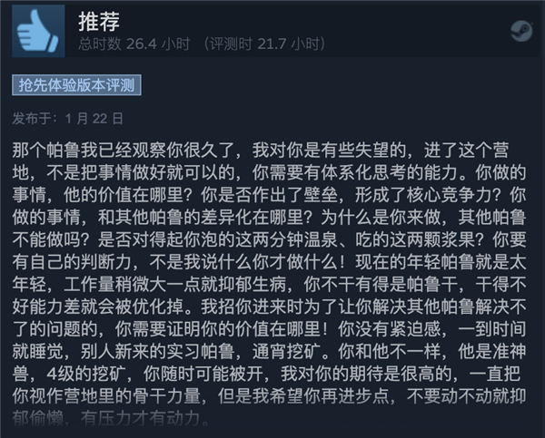 游戏没有剧情,除去联机之外略显套路,捕获足够多的帕鲁,建立足够大的营地后就略显无聊。。。