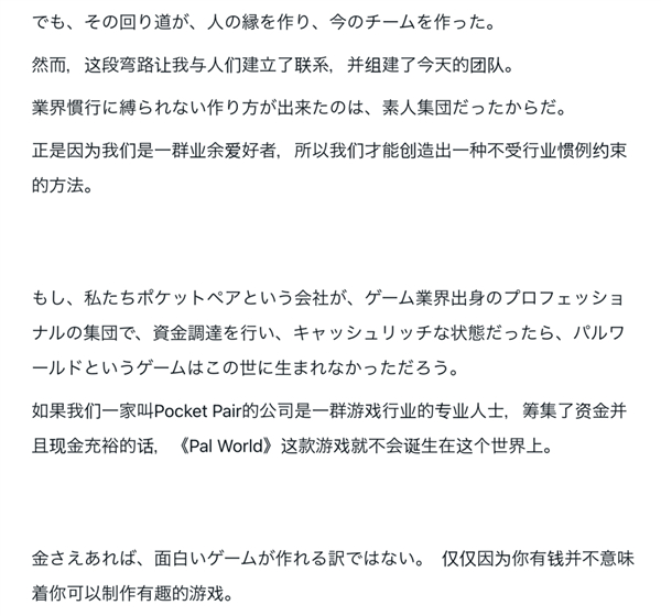 幻兽帕鲁能有现在的成绩,就连 Pocket Pair 社长溝部拓郎也纳闷,用他在 note 网站上写的长文来概括:这玩意就是个奇迹啊。