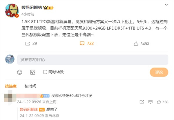 Redmi K70至尊版核心参数曝光:搭载天玑9300+1.5K 8T LTPO屏
