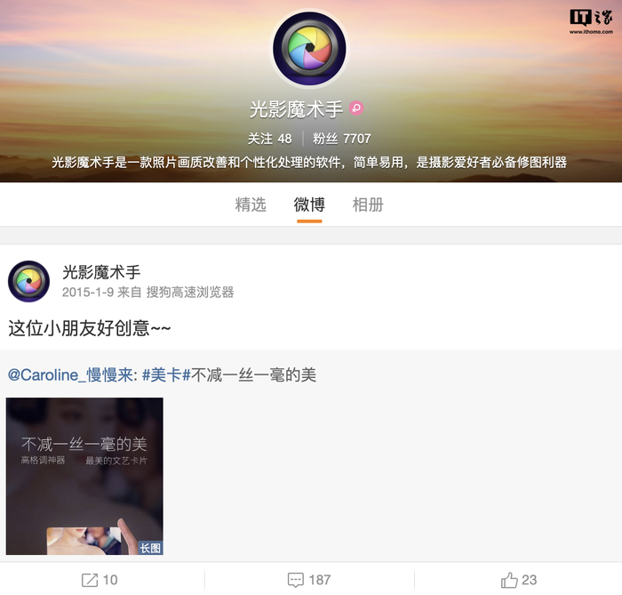 此外,“光影魔术手”官方微博上一条博文仍停留在 2015 年 1 月 9 日,是对自家主打滤镜的手机修图 App“美卡”的介绍,不过这款“美卡”App 已在 2015 年 1 月 15 日停更。
