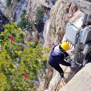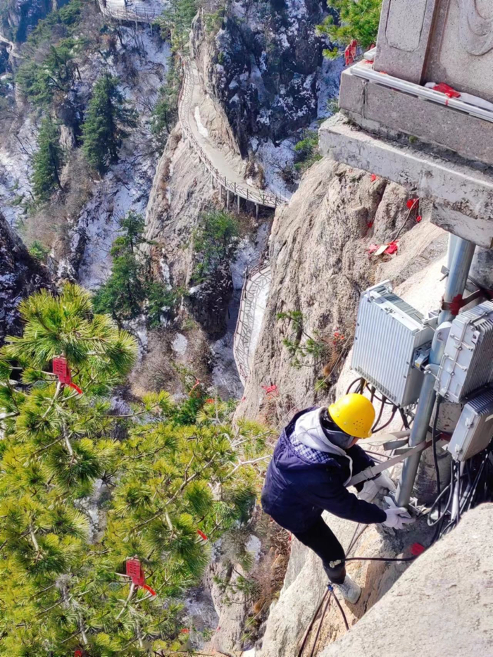 在海拔2000多米的峭壁上建设基站,更是一项不可能完成的任务。老君山金顶作为景区“名片”,是游客钟爱的打卡处。为了保持景观的一致性,景区管委会要求信号塔建在金顶护栏下的隐蔽峭壁上。海拔2000多米的金顶,气温只有零下20多度。在悬崖峭壁上施工,没办法进行自动化安装,施工队员只能身系安全带,将身体悬在空中安装铁塔固件。手冻僵了只能哈口气暖暖再继续安装。经过的游客看见这一幕之后都心疼不已,充满感慨地称他们为2000米峭壁上的通信“蜘蛛侠”。