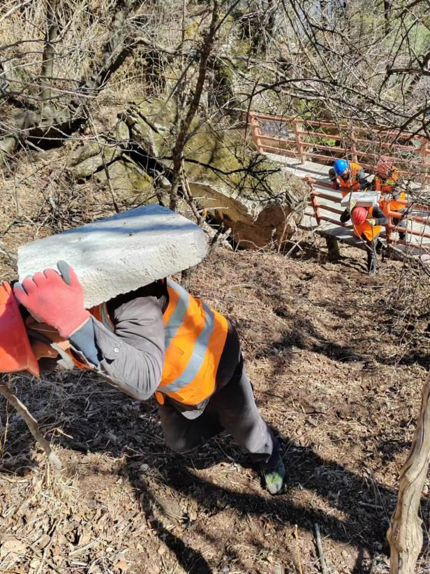 运输最为艰难的天瀑绝唱基站成为“一道坎”。该基站建在半山腰处,运输物料需要步行四五公里的栈道。在寒冷的冬季,由于栈道台阶上积雪成冰,施工队员们背着几百斤的铁塔固件,每走一步都必须小心翼翼。他们一手扶好肩扛物料,一手拉着旁边护栏,一点点将铁件、线缆盘转运上山。仅这一处基站的物料运输,70多个队员足足用了三天时间。
