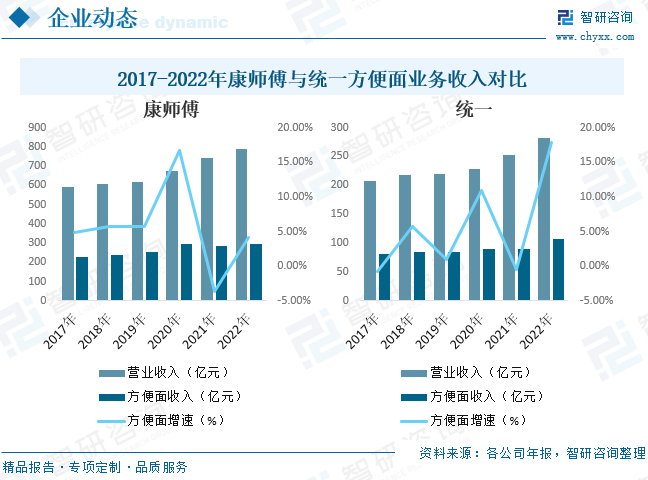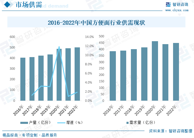 从市场销量来看,以健康营养为主要卖点的高汤面跑赢方便面的大盘。根据世界方便面协会公布的2022年中国方便面需求量及增速数据,2022年的中国方便面需求量为450.7亿份,较2021年增长2.5%。