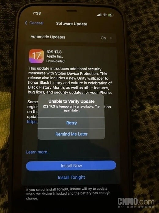 【CNMO新闻】近日,CNMO从外媒获悉,部分iPhone用户在升级iOS 17.3时遇到问题,手机会提示“无法验证更新”。