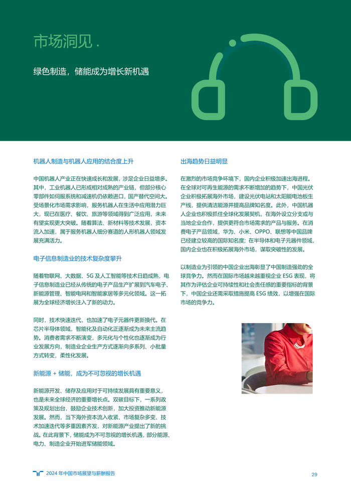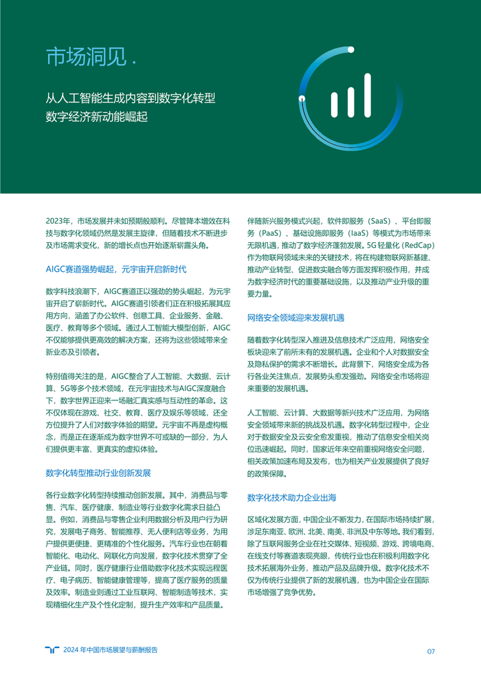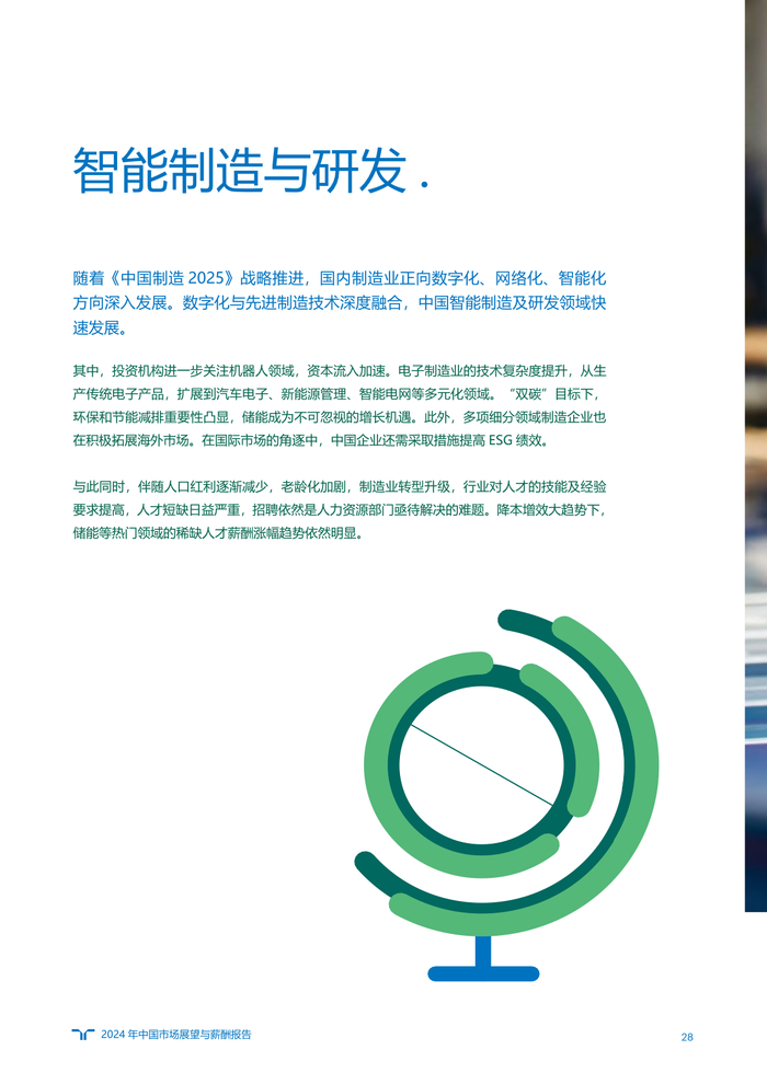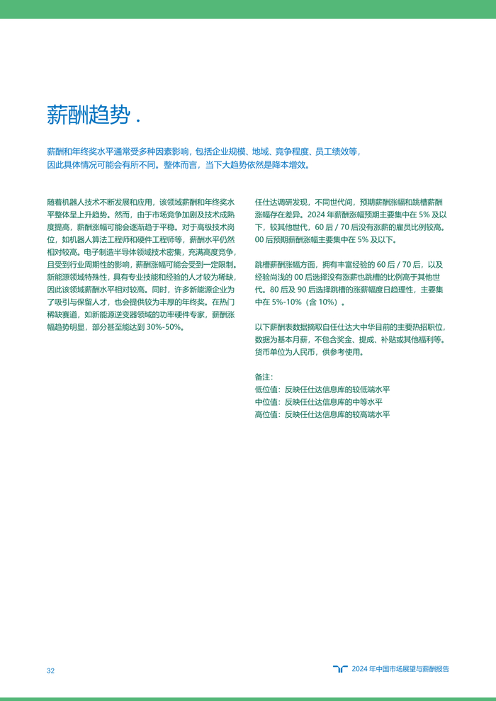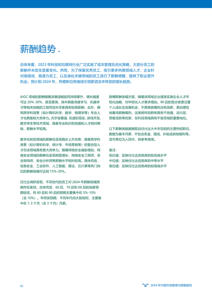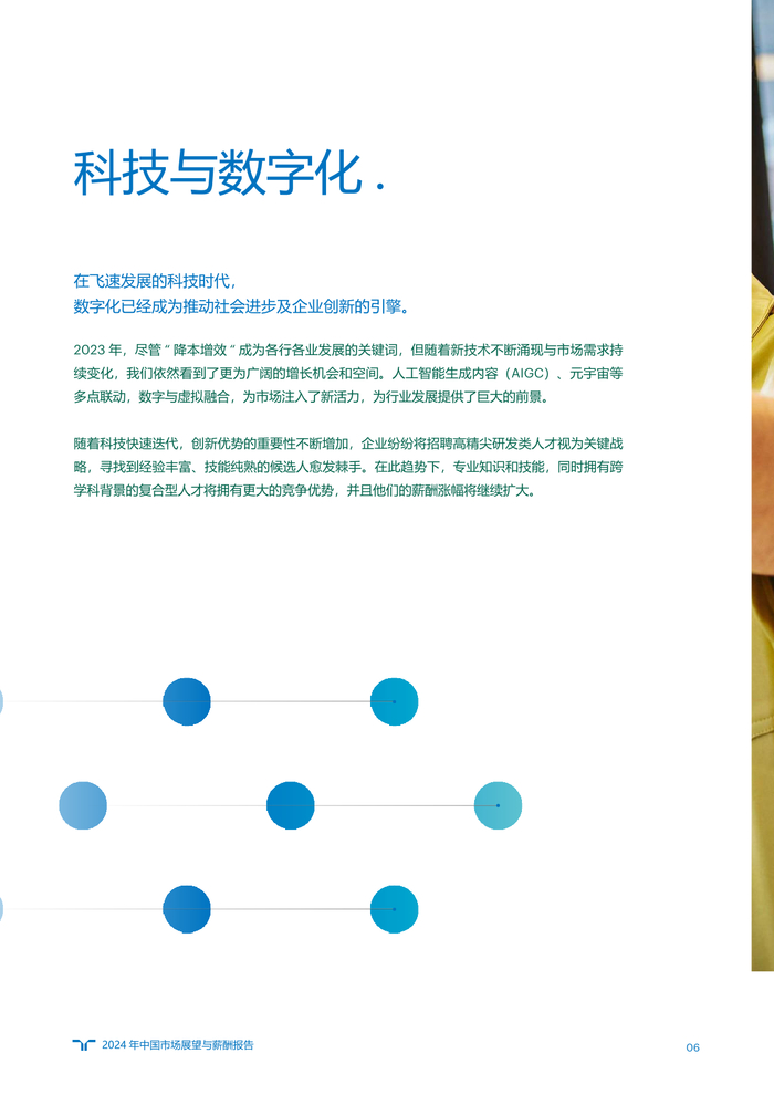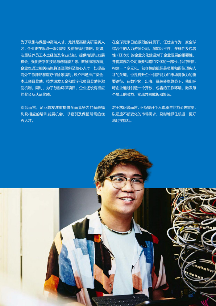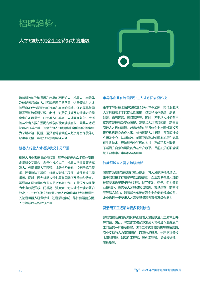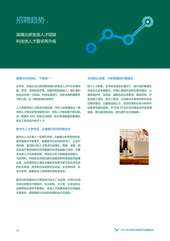 中国经济格局正在经历出海、国产化、数智化和绿色转型 带来的变革。在此过程中,企业招聘热情不减,尤其青睐 中高端人才及稀缺研发类人才。然而,寻找具有丰富经验 及娴熟技能的人才以填补高科技岗位空缺仍然充满挑战, 特别是在信息技术、转型行业、健康医疗及生命科学行业。 伴随进一步降本增效,企业正在探索更加敏捷的组织结构, 例如采用灵活用工模式,聘请更多临时工或合同工等。