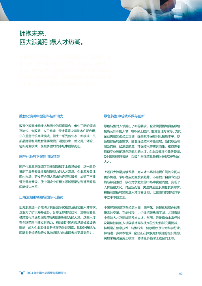上述四大浪潮持续发展,为人才市场创造更广阔的空间与 更多机遇。求职者应把握发展趋势,不断提升自身专业技 能与综合素质,以在竞争激烈的市场中脱颖而出,实现个 人价值最大化。对企业而言,关注并适应浪潮的发展需求, 积极调整招聘策略及人才培养计划,以在激烈的市场竞争 中立于不败之地。