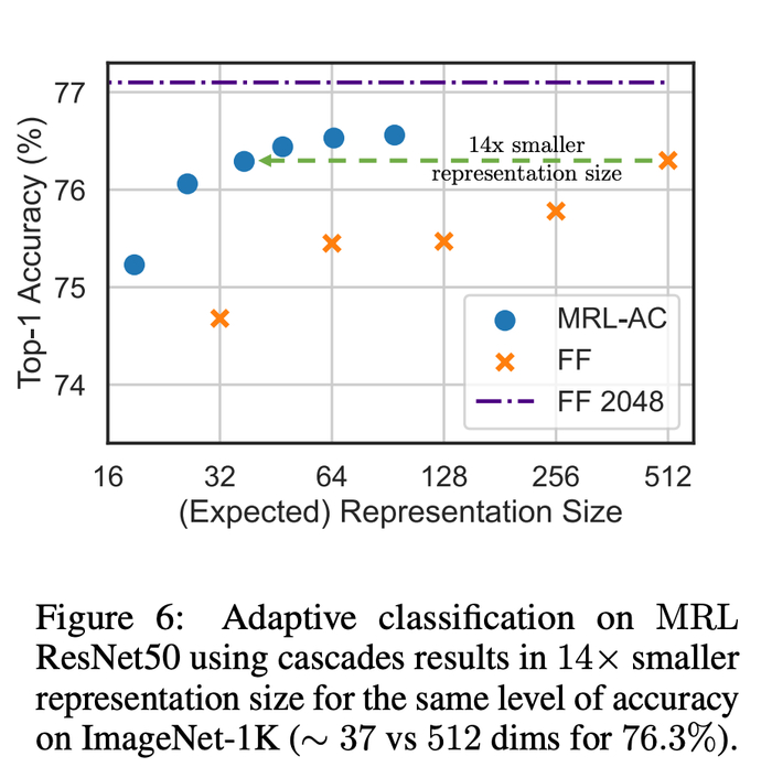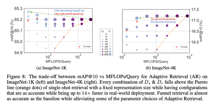 同样地,研究者在自适应检索系统中也使用了 MRL。在给定一个查询的情况下,使用查询嵌入的前几个 dimensions 来筛选检索候选对象,然后连续使用更多的 dimensions 对检索集进行重新排序。与使用标准嵌入向量的单次检索系统相比,这种方法的简单实现可实现 128 倍的理论速度(以 FLOPS 计)和 14 倍的墙上时钟时间速度;需要注意的是,MRL 的检索精度与单次检索的精度相当(第 4.3.1 节)。