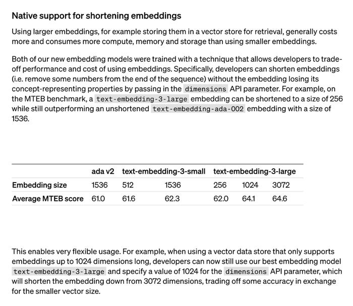 这一技术应用非常灵活:比如当使用仅支持最高 1024 维嵌入的向量数据存储时,开发者现在仍然可以使用最好的嵌入模型 text-embedding-3-large 并指定 dimensions API 参数的值为 1024,使得嵌入维数从 3072 开始缩短,牺牲一些准确度以换取更小的向量大小。