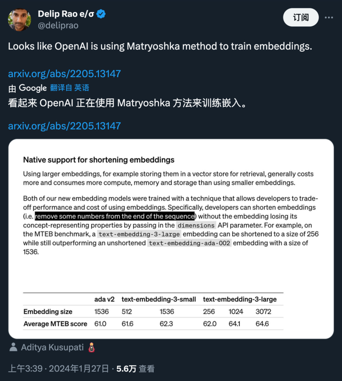 而 MRL 的一作 Aditya Kusupati 也现身说法:「OpenAI 在 v3 嵌入 API 中默认使用 MRL 用于检索和 RAG!其他模型和服务应该很快就会迎头赶上。」