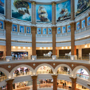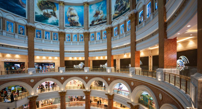 上海环球港的环形走廊上,一对年轻夫妻牵着孩子的手走过,身旁的屏幕上正播放着动画片段。