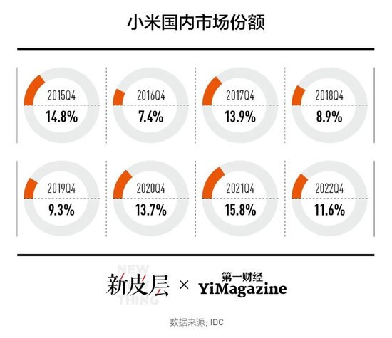2021年是小米手机市场份额上的巅峰。2021年第4季度,小米市场份额达到15.8%——超过其最辉煌的2015年,当时,小米份额为15%。不过,2021年4季度,小米在中国手机市场的出货量排名依然位于第5。