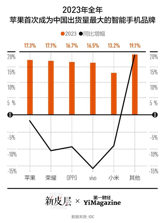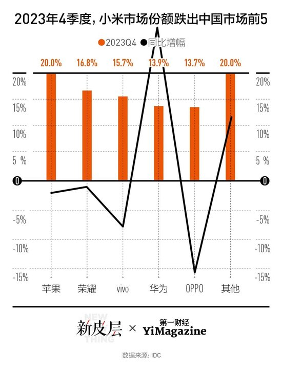 其中,2023年全年,苹果在中国市场的份额为17.3%,首次夺得第一。而2023年第4季度,华为重回中国市场前五(13.9%),而小米跌出前五。