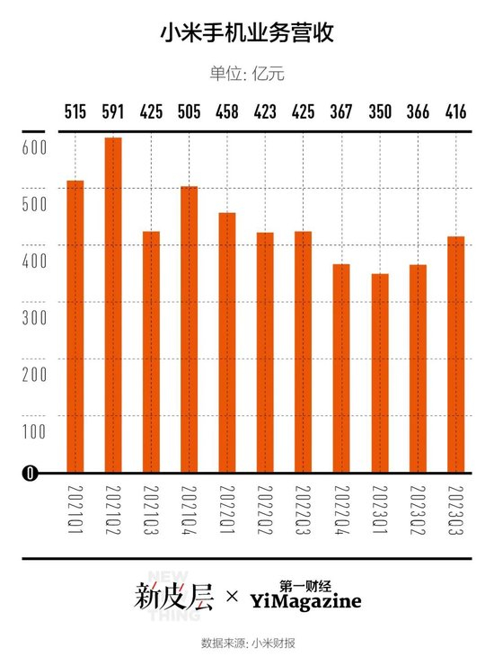 与此同时,小米手机业务营收也自2021年单季500亿元左右的规模,下降至2022年每季400亿元的规模。2022年第4季度和2023年第1季度,小米手机业务营收继续下滑至367亿元和350亿元,同比分别下滑27%和23%。