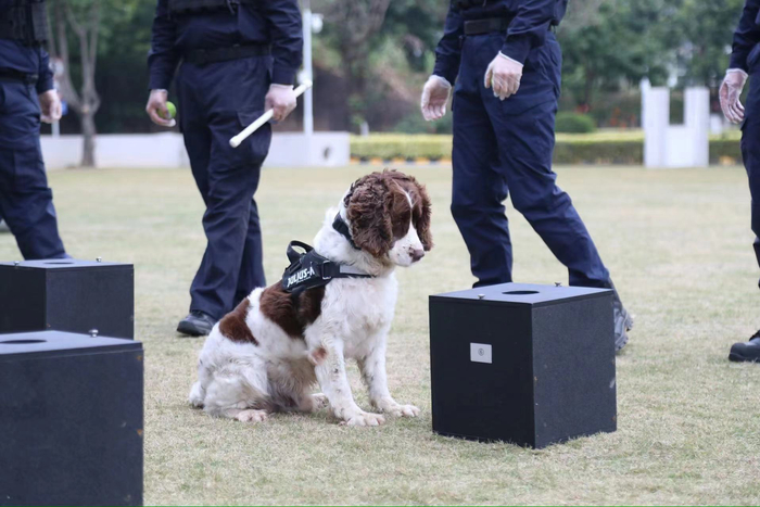 面对十几个外观相同的行李箱,在旁候命的警犬接到训导员指令后立即开展搜索,不需打开行李箱,凭借着灵敏嗅觉,很快在其中一个箱子前蹲下,示意“目标”出现。工作人员随后打开箱子后发现,里面果然藏有“特定装置”!