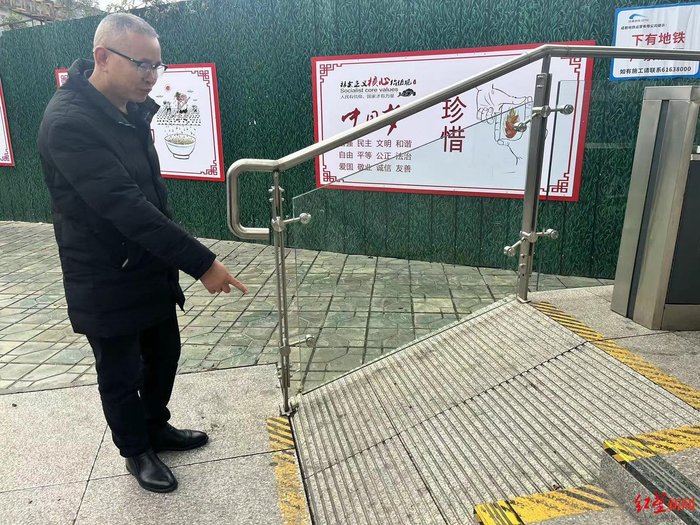 在成都地铁10号线儒林路站B口,楼梯旁的轮椅坡道同样存在坡度过陡的问题。坡道上方的垃圾桶位置太近,轮椅上去也会存在不便。