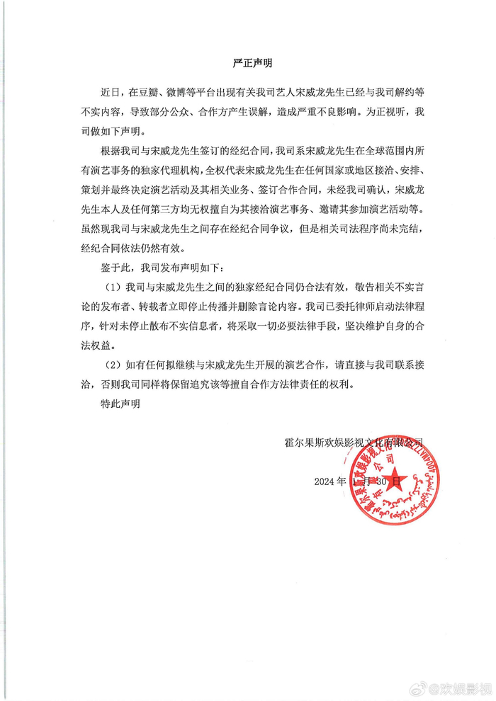 随后,欢娱影视发布严正声明,否认宋威龙解约:“虽然现我司与宋威龙先生之间存在经纪合同争议,但是相关司法程序尚未完结,经纪合同依法仍然有效。”