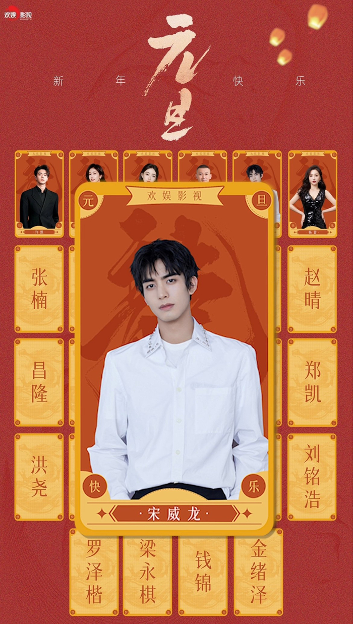 据悉,虽然欢娱影视的官方微博搜索不到宋威龙相关内容,但在其今年1月1日发布的“欢娱影视携全体艺人祝大家元旦快乐!”视频中,还能看到宋威龙的硬照。