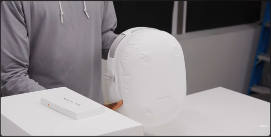 另外,Brownlee 还收到了 Vision Pro 的专属收纳箱,但要注意它不是标配,需要单独花 199 美元购买,质感像一个柔软的大面包。