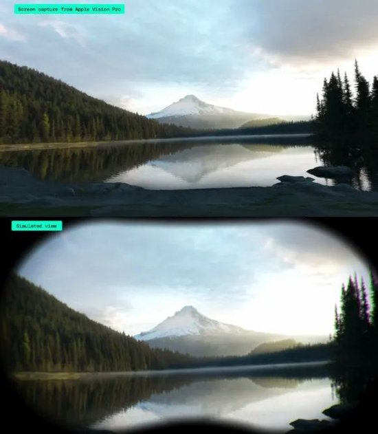 Vision Pro 并没有如人眼般的视野,它更像是用双筒望远镜看世界。并且镜头边缘有彩色边,那里的分辨率一般,因此视野也会被进一步压缩。