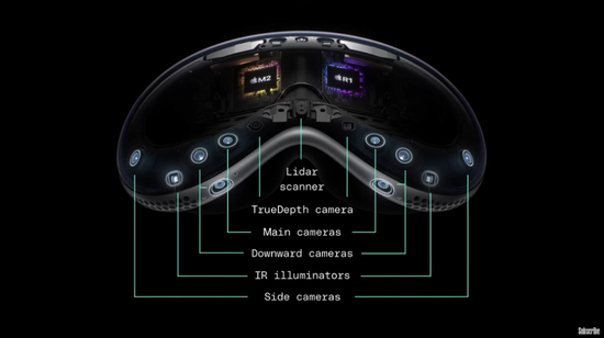 苹果通过 12 颗摄像头(2 颗 RGB 摄像头、4 颗下侧视角摄像头、2 颗外侧视角摄像头、4 颗内侧红外摄像头)+5 颗传感器(含 1 颗 dToF 传感器)的组合充当人眼,尽可能让外界环境看起来更真实。