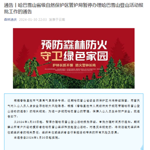 1月30日,迪庆藏族自治州哈巴雪山省级自然保护区管护局在官方微信账号上发布通告,明确暂停办理哈巴雪山登山活动报批工作,通告自1月30日起实施。