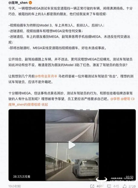 2023年12月,有网友在社交平台发文表示:自己朋友在未违反任何交通法规的情况下,用手机拍摄看到的理想MEGA测试车,在即将出隧道时,理想MEGA进行实线变道,阻挡视频拍摄车辆。