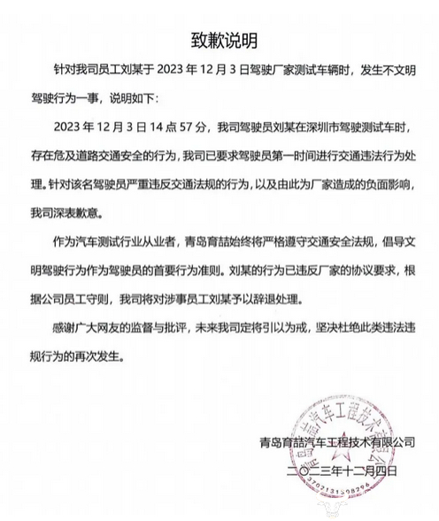 很快,涉事汽车测试公司发表致歉声明,承认公司员工存在危及道路交通安全的行为,并表示:已要求驾驶员第一时间进行交通违法行为处理。据声明内容显示,涉事员工刘某已被辞退。