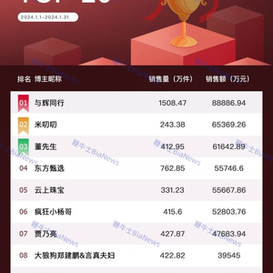 抖音1月直播带货榜:与辉同行高居榜首,俞敏洪成最大赢家