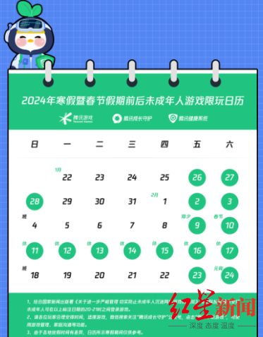 此前,网易以及腾讯均发布寒假期间未成年人游戏限玩时间表,未成年人根据规定都可以共计玩16小时的游戏。米哈游方面,红星新闻记者联系工作人员得知其寒假期间限玩规则也与其余两家相同,测算下来也是总共16个小时的游玩时间。