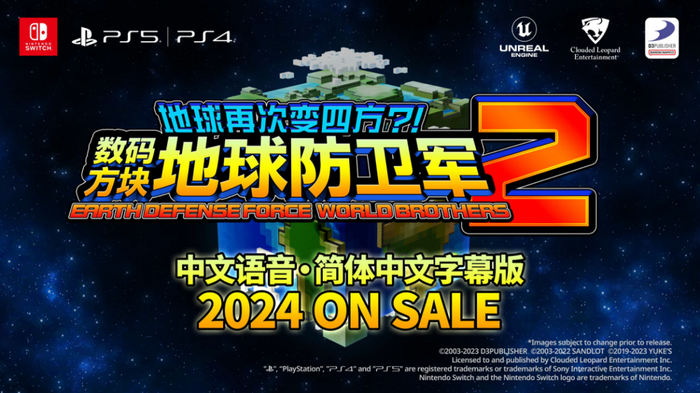 此外,外传衍生作品《地球再次变四方?!数码方块地球防卫军2》也定于2024年,在PS4/PS5及Switch平台发售,预计直接收录中文语言版本。