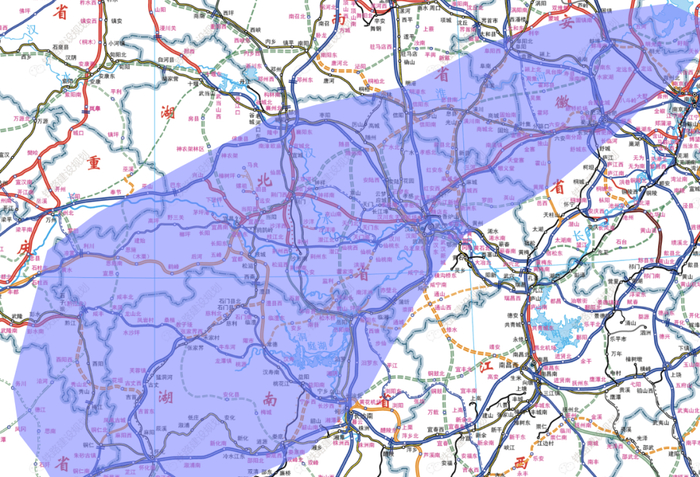 综合当前气象部门预报结果,划定的可能受降雪、冻雨严重影响的区域(蓝色区域)和铁路交通情况。(注:此图包括部分规划的铁路线路)