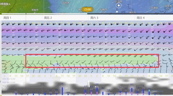 武汉周边区域的气温随海拔高度(纵坐标)和时间(横坐标)变化的数值预报结果。可以看到2月2日—4日,这一区域约1000—3000米高空气温高于0℃(红框标出),但大气低层和地面又低于0℃,很有可能形成冻雨。