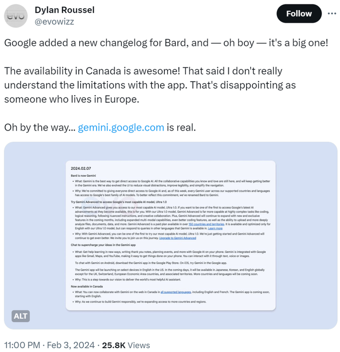 除了名称变化之外,用户最为关注的当然还有 Gemini Ultra。更新日志显示,用户将从 2 月 7 日起可以访问「Gemini Advanced」,并通过它体验到谷歌最强大的模型 Gemini Ultra 1.0。