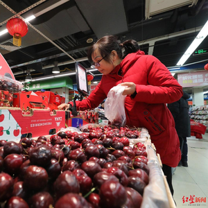 当下,这家店卖得最贵的水果,无疑是智利车厘子。在1月中旬,红星新闻记者咨询明宏果都一箱5kg的车厘子的价格,被告知销售价为400元,且“一分不能少”。但1月底,随着更多海运而来的智利车厘子涌入中国市场,前述5kg包装箱品种的车厘子,价格已降到约320元。随着价格的降低,“吃车厘子自由”的讨论还上过热搜。