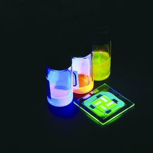 不同钙钛矿材料和钙钛矿发光二极管在紫外灯下的明亮荧光。课题组供图