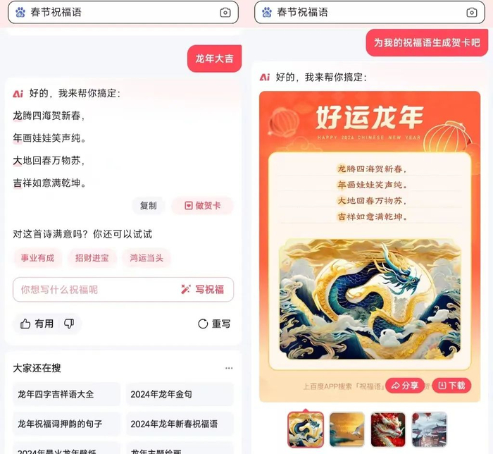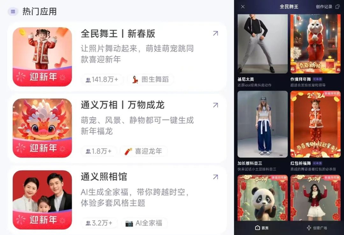 今年过年,人工智能注定比人工更热闹。 腊月进入尾声,通义千问、智谱清言、文心一言等数款AI应用都上架了大量春节主题功能,具体类型包括不限于: 一键解决“面对七大姑八大姨如何在新年祝福领域打出区分度至少别重复”这一问题的拜年祝福生成器; 一键解决“自家大人别家长辈逼问买车买房催婚养娃等一系列灵魂拷问”这一问题的家庭聚餐话题应答器; 让作画无能群体也能够在朋友圈搞点独特新年祝福的AIGC红包封面、春节贺图制作器…… 甚至,还能用多角度照片生成个人专属的AI智能体,让数字人代替你入镜祝福视频、春节合影。 用好春节档上新的这批AI应用,也许真能让打工人过个多点红火、少点社恐的新年假期——AI的“红”利,这不就来了吗。 通义千问:继续死磕图像AI蓝媒汇曾在一月初报道了阿里云通义千问APP红极一时的“全民舞王”功能。新年将至,这一功能更新到了“新春版”。 依旧很红——阿里甚至将通义千问APP的图标都整个刷成了红色。