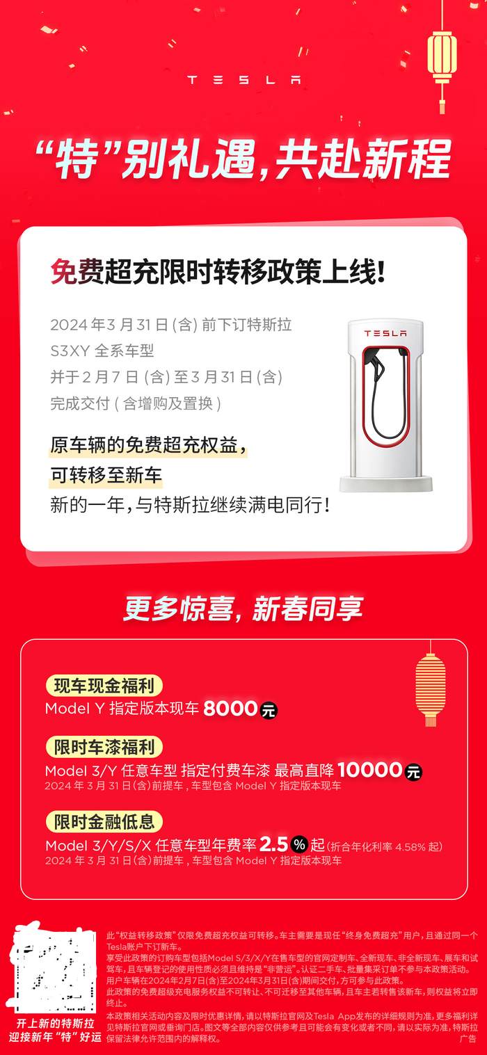 还有 FSD / EAP 限时转移、免费超充限时转移等多重新春好礼,具体政策可见下图: