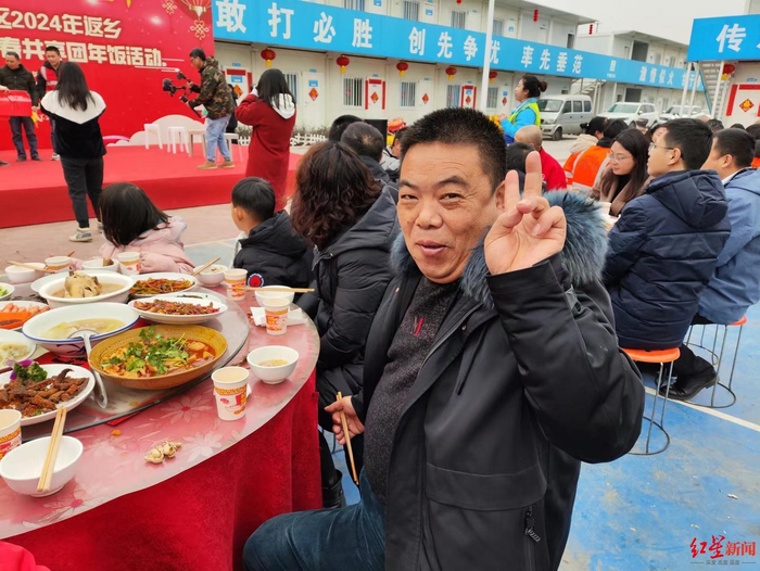 “在这里上班既能赚钱,又能照顾家人。”他兴奋地说,“在家门口、在自己工作的地方,和这么多工友一起团年,有种自家请客的感觉,挺自豪的!”