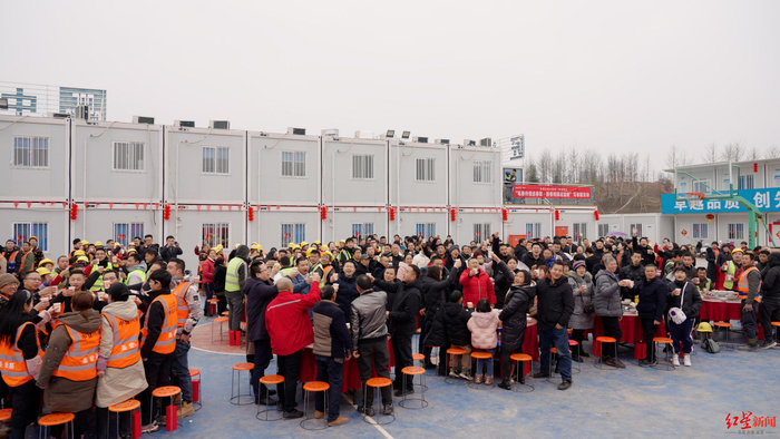 上午11点,随着舞台上音乐响起,热闹的团年饭在歌声和舞蹈中正式拉开帷幕。来自五湖四海的工友们围桌而坐,同斟共饮。肘子、蒸甲鱼、咸烧白……四川坝坝宴的“九斗碗”豪华配置,弥漫着阵阵香气,给工友们带来新春佳节的丝丝暖意。