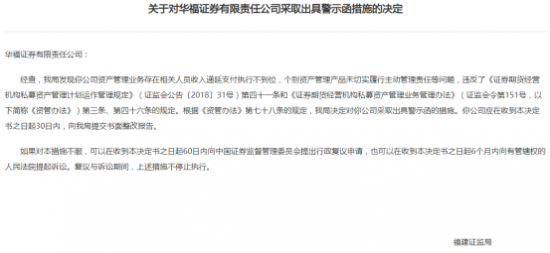 引人注意的是,今年5月29日,华福证券因资产管理业务存在相关人员收入递延支付执行不到位,个别资产管理产品未切实履行主动管理责任等违规问题,被福建证监局出具警示函。