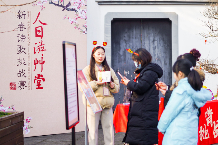 大年初一,成都杜甫草堂博物馆的新春诗歌挑战赛吸引了不少游客。按照规则,参与挑战者从一本诗集中随机抽取3首,如果能在规定时间内背诵,将获草堂当日参观券一张。
